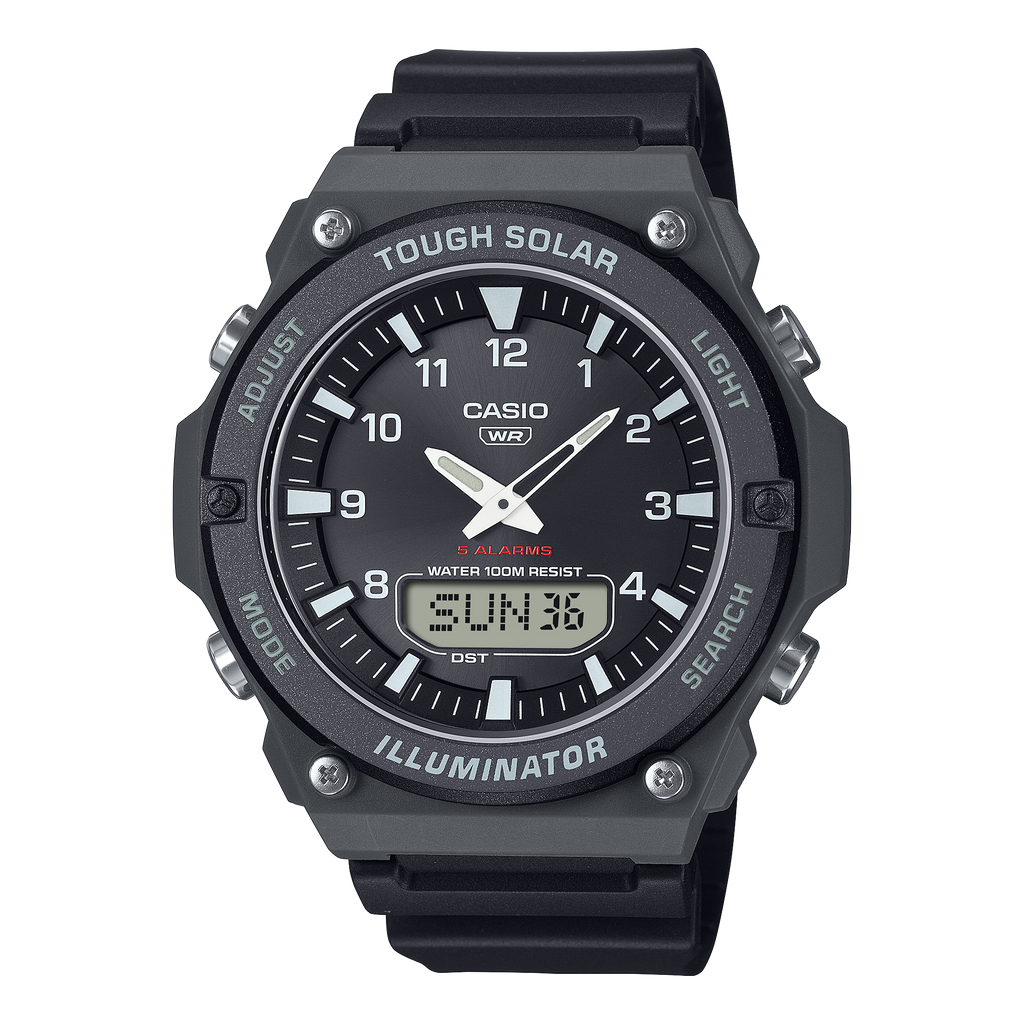 The round, flat bezel is paired with indexes and watch hands in white for easy-to-read visibility. The handy LCD at the 6 o’clock position displays the date, day, and world time.