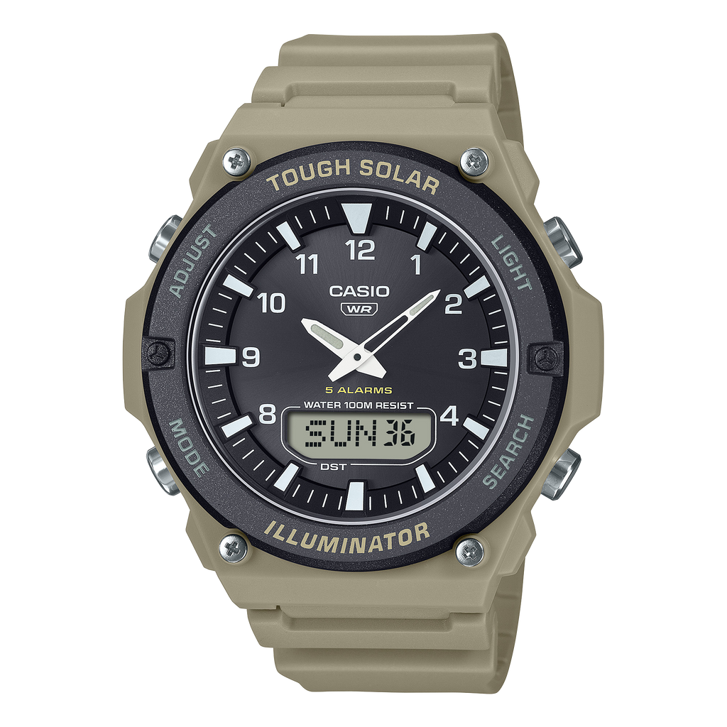 The round, flat bezel is paired with indexes and watch hands in white for easy-to-read visibility. The handy LCD at the 6 o’clock position displays the date, day, and world time.