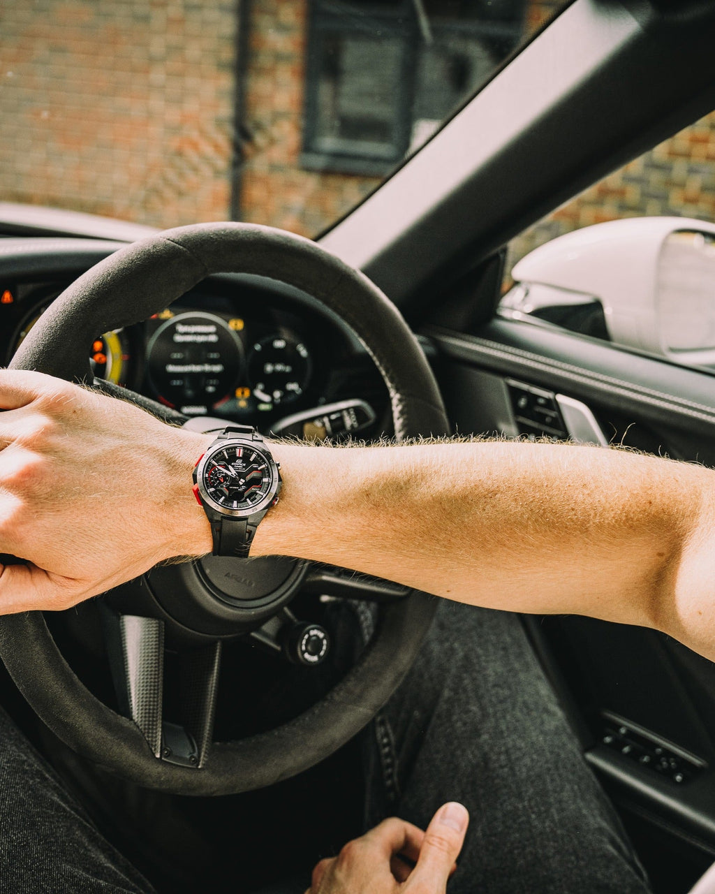 The Casio Edifice ECB-2200P-1ADF Windflow Men Watch takes inspiration from the aerodynamics of formula race cars, featuring a carbon fiber-reinforced resin case and a breathable resin band with vent-style openings. Its Bluetooth® Smartphone Link allows automatic time adjustment, world time for over 300 cities, and stopwatch data transfer for up to 200 lap times. Powered by Tough Solar, it runs up to 7 months on a full charge and includes a 1/100-second stopwatch, Super Illuminator LED light, and scratch-resistant sapphire crystal for durability.
