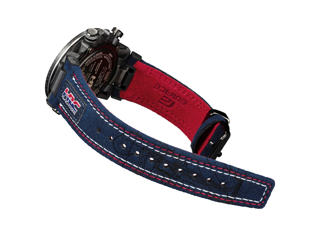 Seize all the passion of the HRC (Honda Racing  Corporation) spirit in a red, blue, and white, high-performance EDIFICE that embodies speed and intelligence on the racetrack.